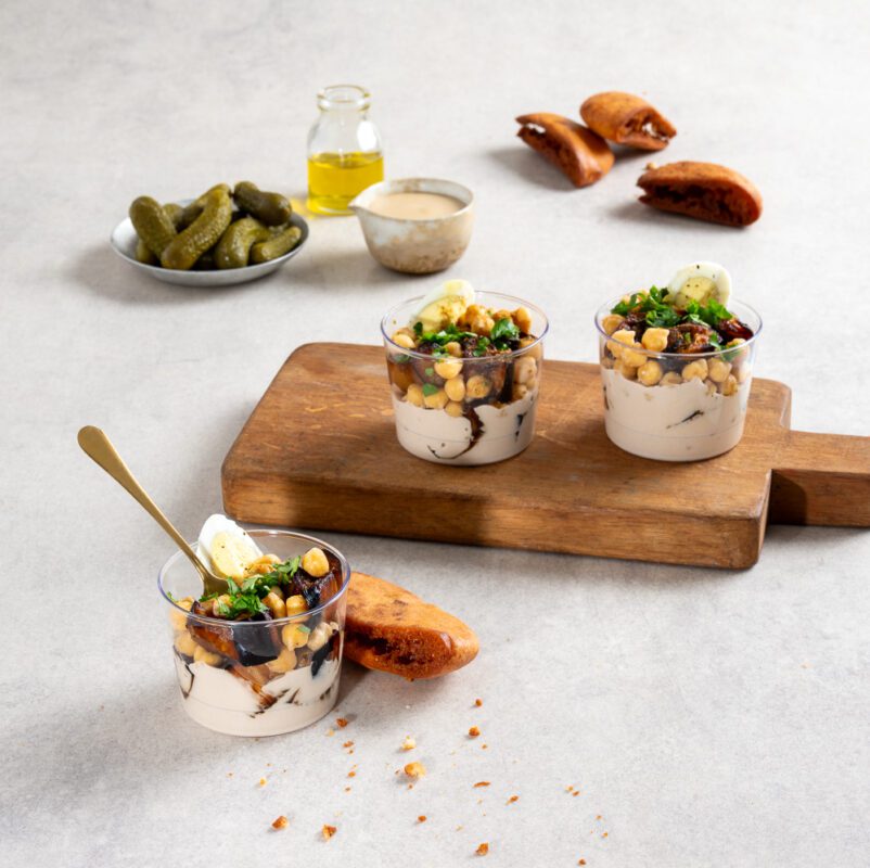 כוס טאפאס סביח מפורק עם חציל, גרגירי חומוס, טחינה, ביצה