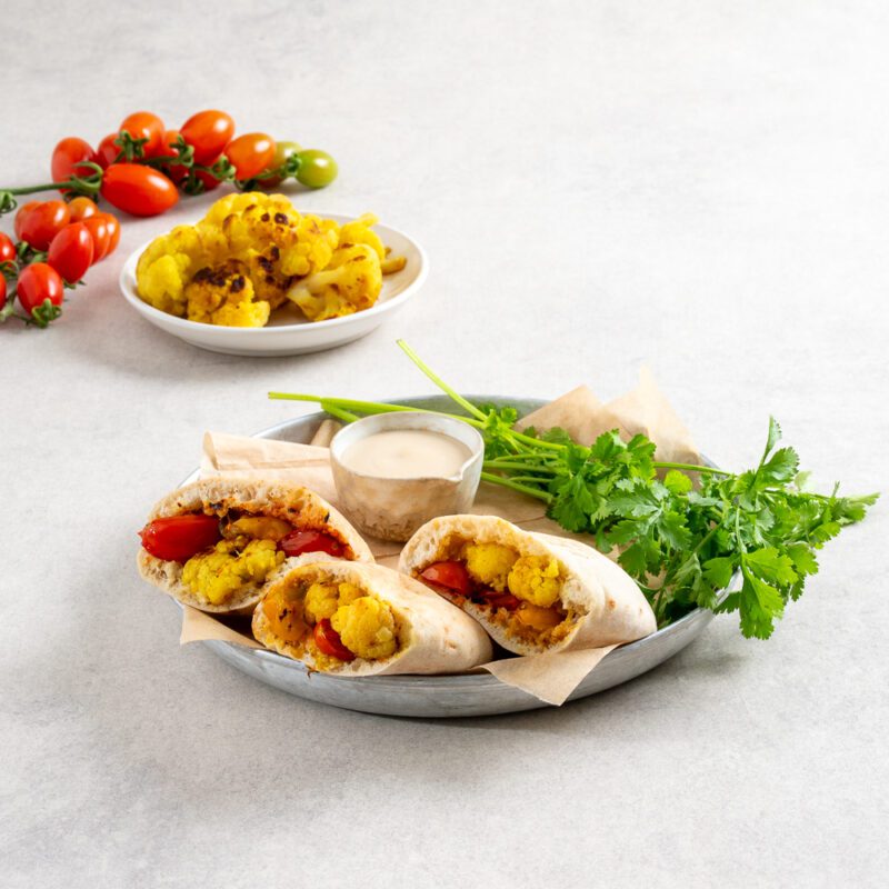 מיני פיתה כרובית עם טחינה, עגבניית תמר, מלפפון חמוץ